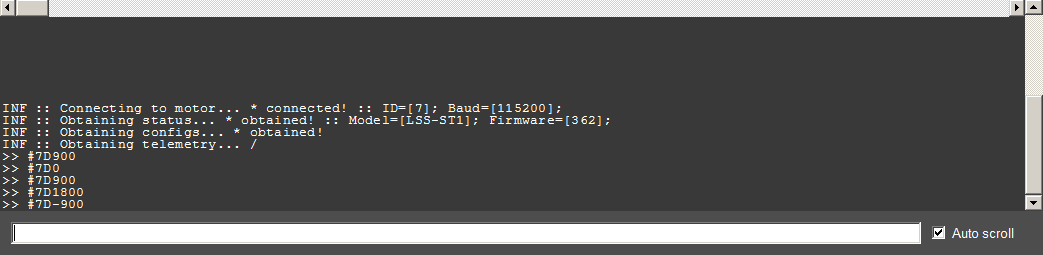 The command line interface both allows you to communicate directly with an individual servo, send commands to it and view replies to queries. When "LSS-All (254; ---k)" is selected in the list of servos, the command line is used to send the same action or configuration command to all detected servos. For example, typing D1800 and pressing enter will send that same position command to each of the detected servos.